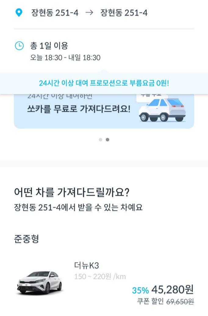 이어서 쏘카나 렌터카를 이용 시