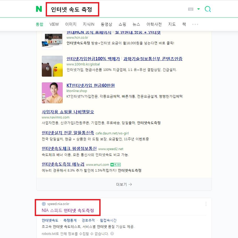 인터넷 검색창에 인터넷 속도 측정